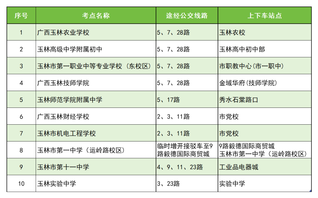 玉林市第一中學(xué)(運(yùn)嶺路校區(qū))考點(diǎn)11:00-11:30,16:30-17:00 在考點(diǎn)安排公交車和值勤人員,負(fù)責(zé)將考生接送到9路毅德國際商貿(mào)城站點(diǎn)。
