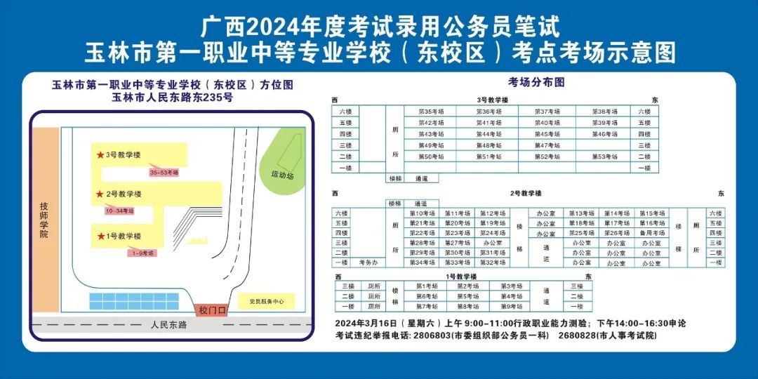2024年選擇在玉林考區(qū)參加考試的考生人數(shù)較多,屆時(shí)考點(diǎn)區(qū)域內(nèi)的食宿、交通較為緊張。請?zhí)崆傲私獗救怂诳键c(diǎn)具體位置,熟悉考點(diǎn)周邊情況,根據(jù)考點(diǎn)的情況合理做好食宿安排和出行計(jì)劃。需要特別注意的是:玉林市第一職業(yè)中等專業(yè)學(xué)??键c(diǎn)是設(shè)在該校的東校區(qū)(人民東路東235號(hào));玉林市第一中學(xué)考點(diǎn)是設(shè)在該校的運(yùn)嶺路校區(qū)(二環(huán)北路1228號(hào))!
