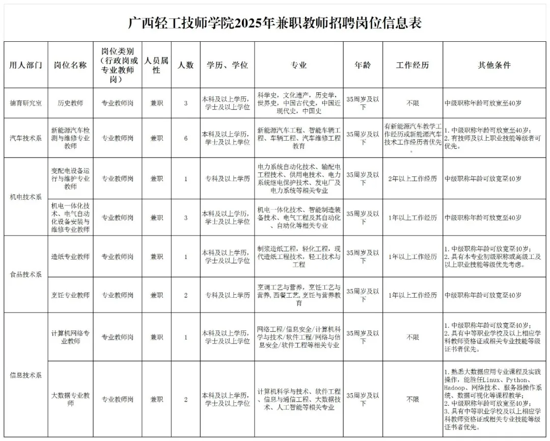 歷史教師,新能源汽車(chē)檢測(cè)與維修專(zhuān)業(yè)教師,變配電設(shè)備運(yùn)行與維護(hù)專(zhuān)業(yè)教師,機(jī)電一體化技術(shù)、電氣自動(dòng)化設(shè)備安裝與維修專(zhuān)業(yè)教師,造紙專(zhuān)業(yè)教師,烹飪專(zhuān)業(yè)教師,計(jì)算機(jī)網(wǎng)絡(luò)專(zhuān)業(yè)教師,大數(shù)據(jù)專(zhuān)業(yè)教師。