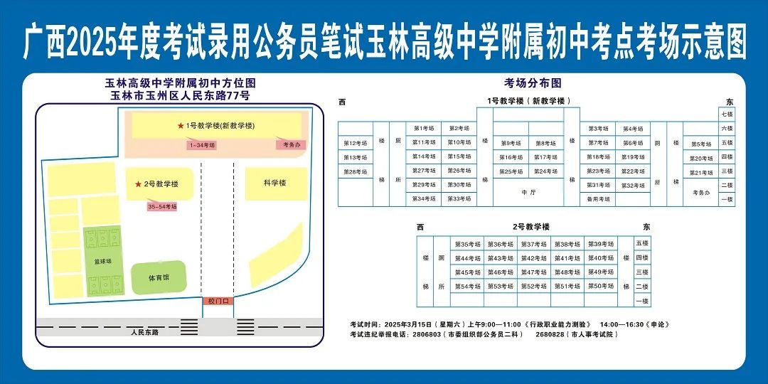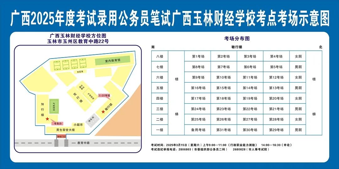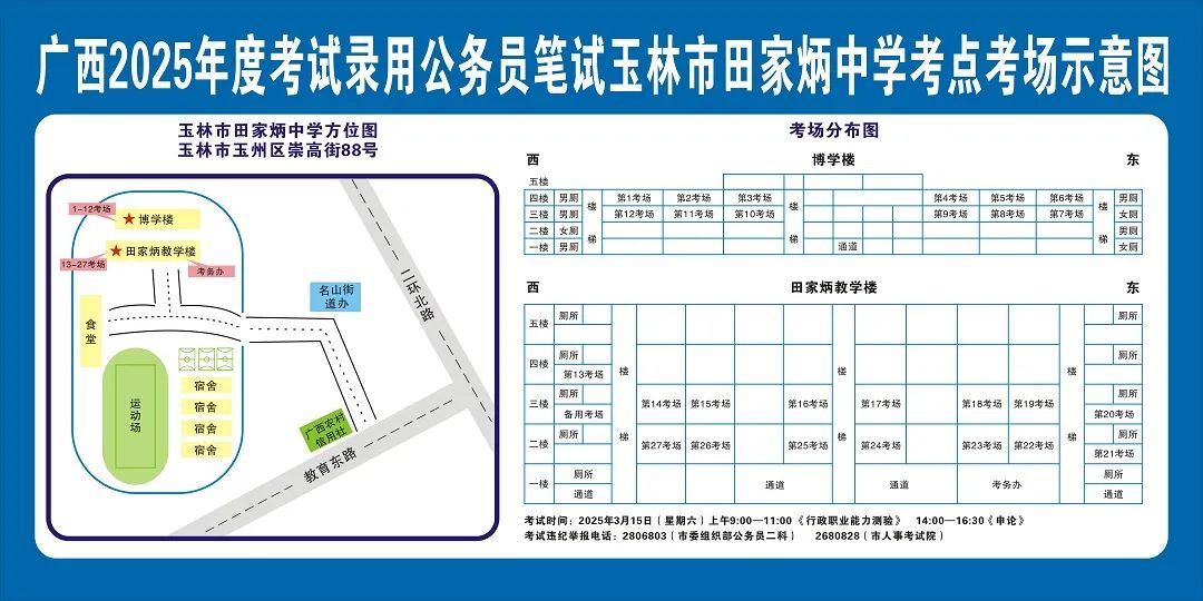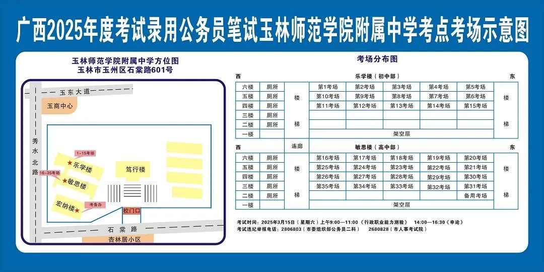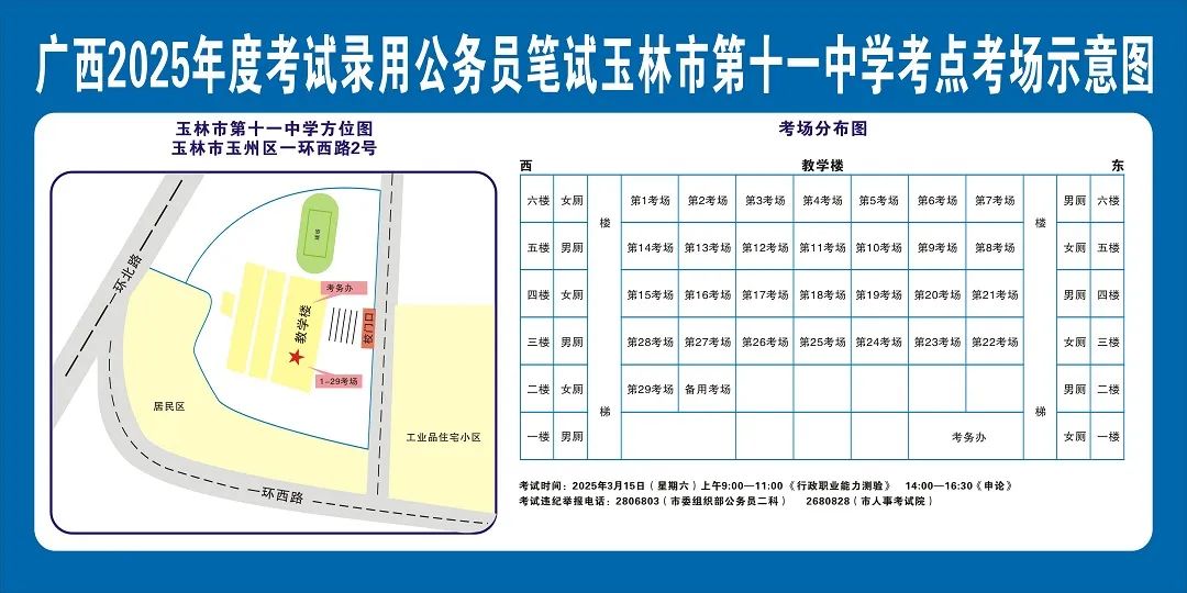 除考試當(dāng)天考生可以進(jìn)入考點外,考生不得提前進(jìn)入考點查看考場(學(xué)校將在大門處擺放考場分布示意圖),玉林考區(qū)11個考點的考場布置情況如下: