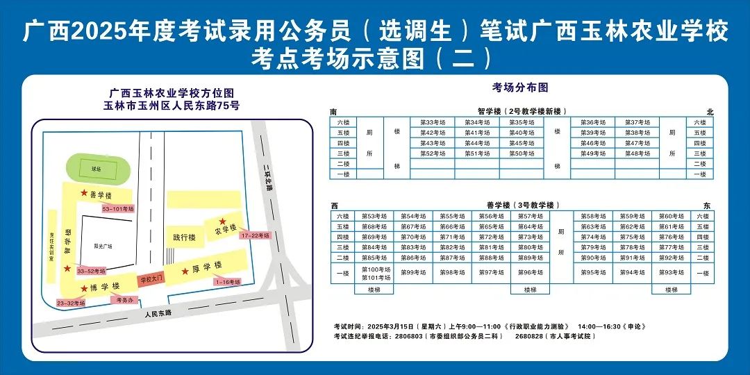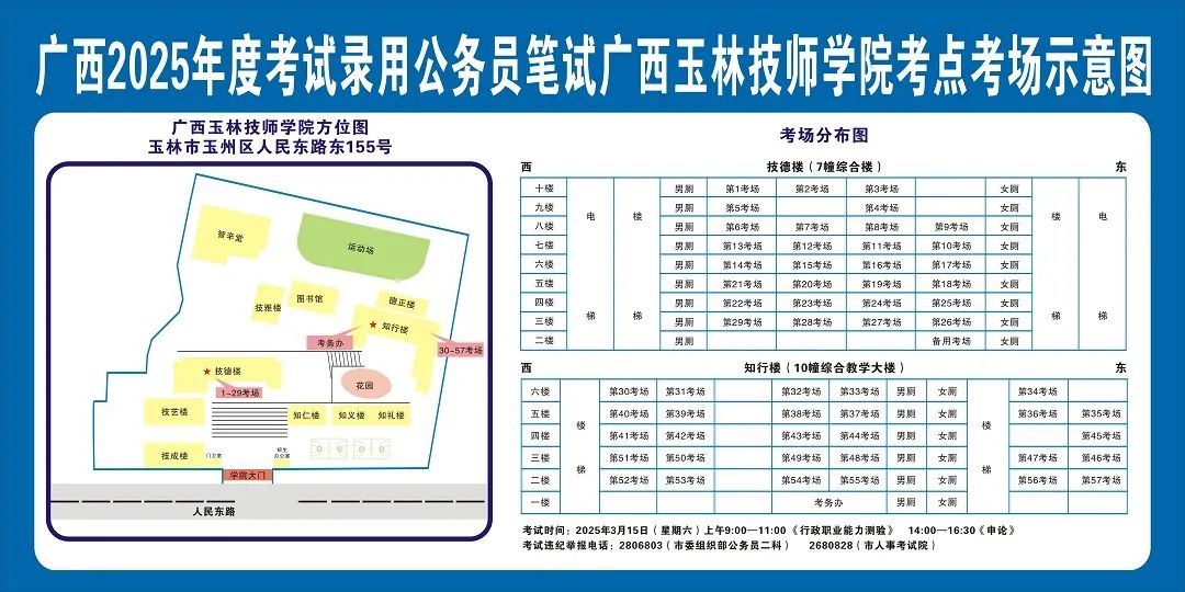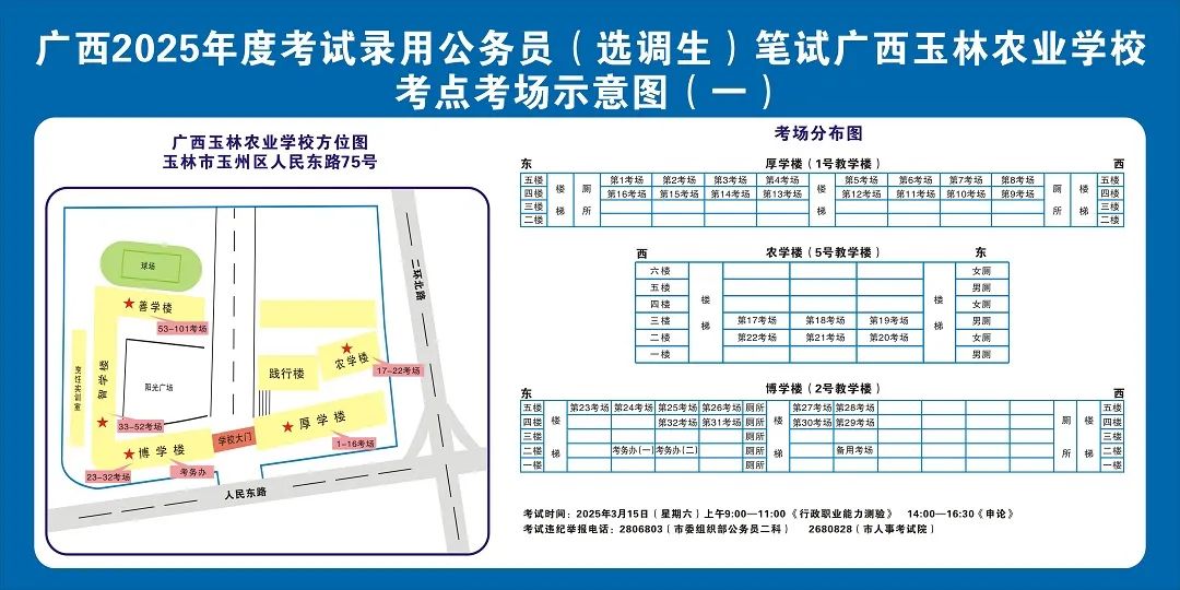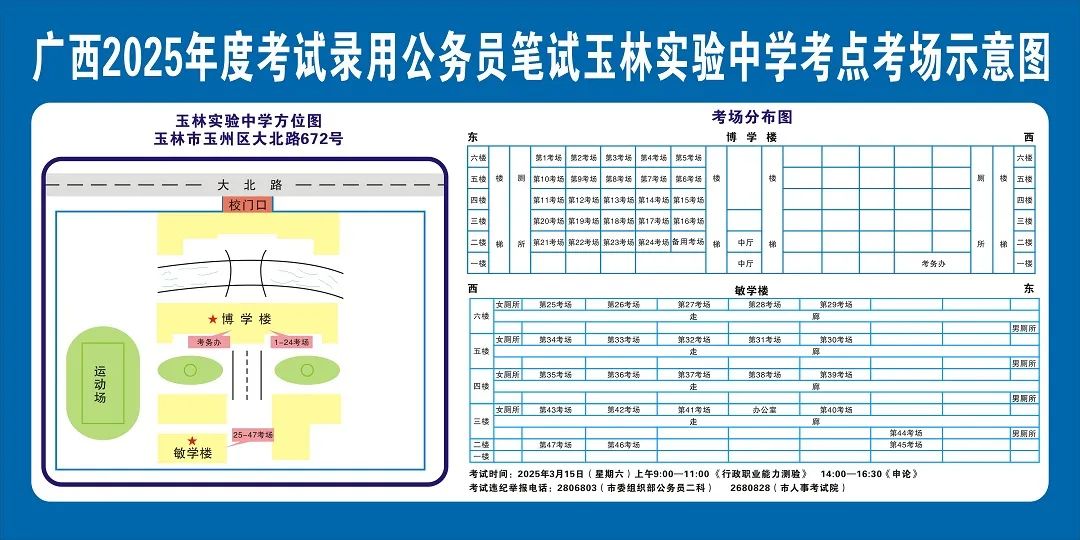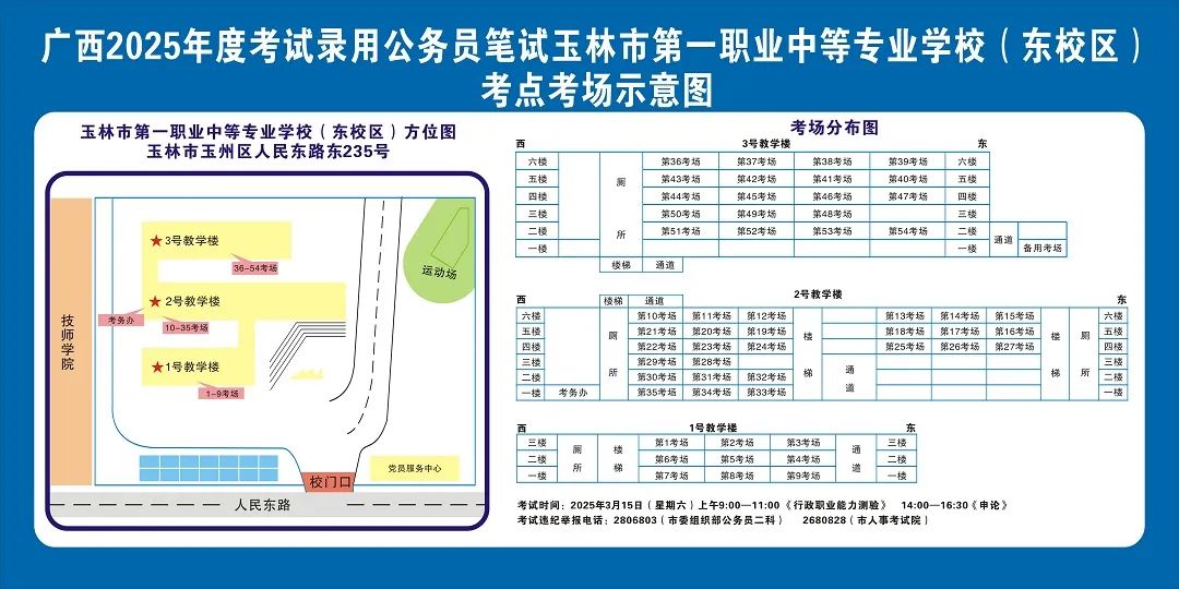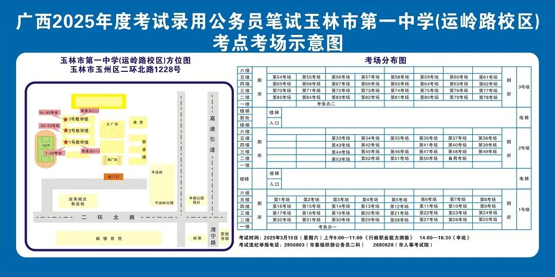 除考試當(dāng)天考生可以進(jìn)入考點外,考生不得提前進(jìn)入考點查看考場(學(xué)校將在大門處擺放考場分布示意圖),玉林考區(qū)11個考點的考場布置情況如下: