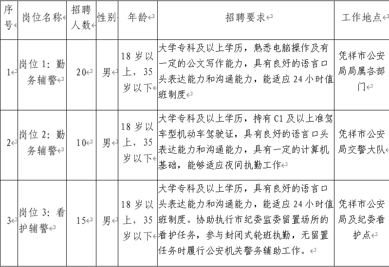 為適應(yīng)憑祥市公安機關(guān)管理工作發(fā)展需要,憑祥市公安局決定面向社會公開招聘40名警務(wù)輔助人員(以下簡稱輔警)。具體事宜如下: