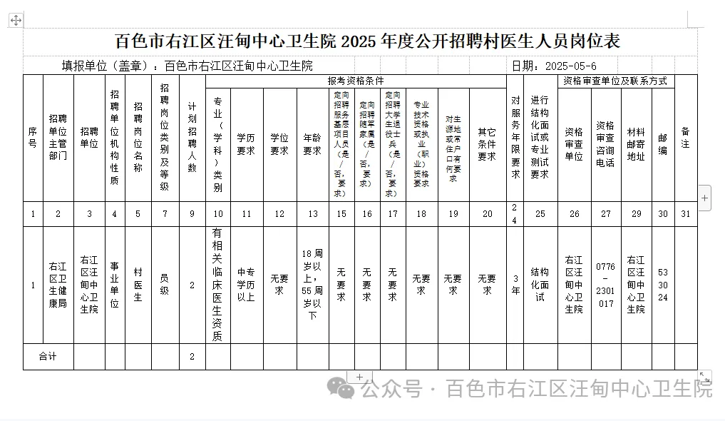 3.報名地點:百色市右江區(qū)汪甸中心衛(wèi)生院三樓辦公室,聯(lián)系人:林紅青 聯(lián)系電話:0776-2301017。因報名信息填寫錯漏等所造成的后果,本單位不負任何責任。