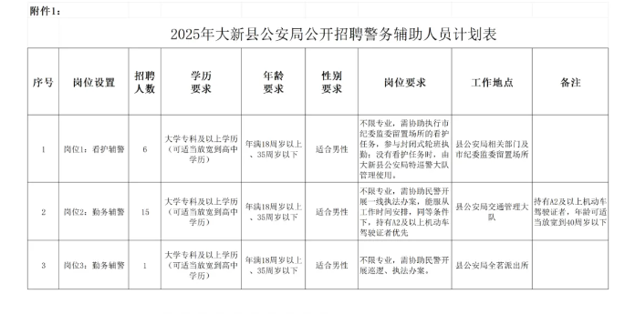 為適應(yīng)當(dāng)前社會(huì)治安形勢(shì)的需要,進(jìn)一步充實(shí)公安機(jī)關(guān)警務(wù)輔助力量,推進(jìn)平安大新建設(shè),有效維護(hù)社會(huì)治安穩(wěn)定,根據(jù)《廣西壯族自治區(qū)公安機(jī)關(guān)警務(wù)輔助人員條例》《崇左市公安機(jī)關(guān)警務(wù)輔助人員管理辦法》《崇左市公安機(jī)關(guān)警務(wù)輔助人員管理招聘管理辦法》(試行)等文件精神,經(jīng)縣人民政府同意,大新縣公安局決定面向社會(huì)公開(kāi)招聘警務(wù)輔助人員22名(以下簡(jiǎn)稱輔警)。現(xiàn)將有關(guān)事項(xiàng)公告如下: