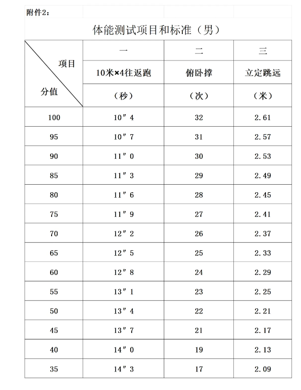 3.體能測(cè)試。參照人民警察招錄標(biāo)準(zhǔn)執(zhí)行(具體項(xiàng)目和標(biāo)準(zhǔn)詳見(jiàn)附件2)。測(cè)試項(xiàng)目:10米×4往返跑、立定跳遠(yuǎn)、俯臥撐,體能測(cè)試三項(xiàng)全部達(dá)標(biāo)的,方為合格。
