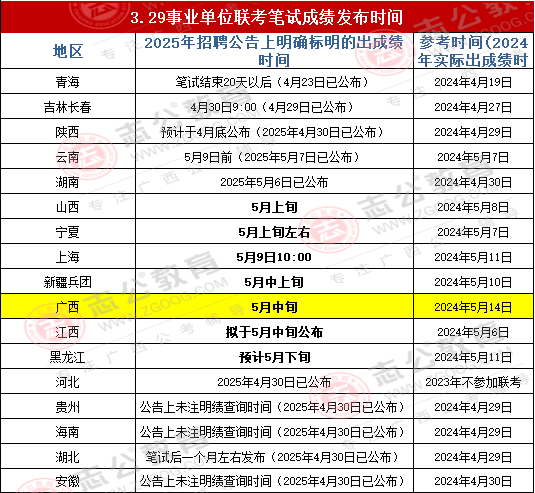 無(wú)論是青海還是貴州,或者是湖北,都是按照公告或去年出成績(jī)時(shí)間差不多的,那么2025年廣西事業(yè)單位筆試成績(jī)是否和2024年一樣為5月14日發(fā)布?