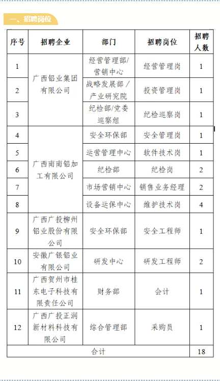 2.報(bào)名方式:應(yīng)聘者可登錄廣投集團(tuán)官方網(wǎng)站(http://www.gig.cn),依次點(diǎn)擊“人力資源-廣納英才”,進(jìn)入“社會招聘-招聘崗位”專欄,找到“鋁業(yè)”相應(yīng)崗位并投遞簡歷。