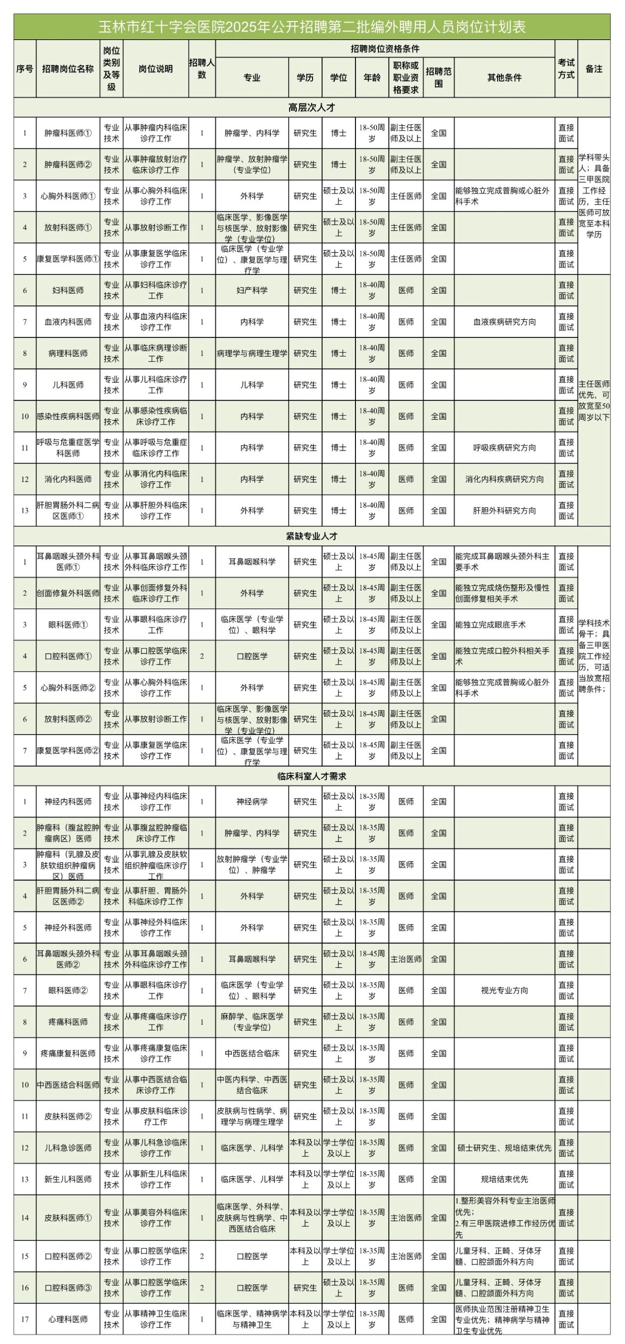 4.醫(yī)師人員:采取直接面試進(jìn)行考核,醫(yī)院統(tǒng)一安排集體面試;面試考核內(nèi)容包括專業(yè)知識(shí)、學(xué)術(shù)水平、學(xué)習(xí)和業(yè)務(wù)能力、組織協(xié)調(diào)能力、職業(yè)性格傾向、語言表達(dá)能力、興趣愛好和特長等。