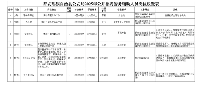 都安瑤族自治縣公安局本次擬招聘警務(wù)輔助人員30人,具體招聘崗位、人數(shù)、資格條件詳見《都安瑤族自治縣公安局2025年公開招聘警務(wù)輔助人員崗位設(shè)置表》