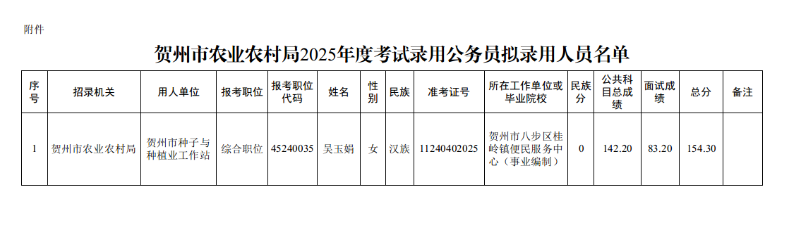 1 賀州市人力資源和社會(huì)保障局2025年公開(kāi)遴選公務(wù)員擬任用人員名單