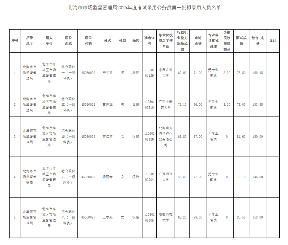 附件:北海市市場監(jiān)督管理局2025年度考試錄用公務員第一批擬錄用人員名單