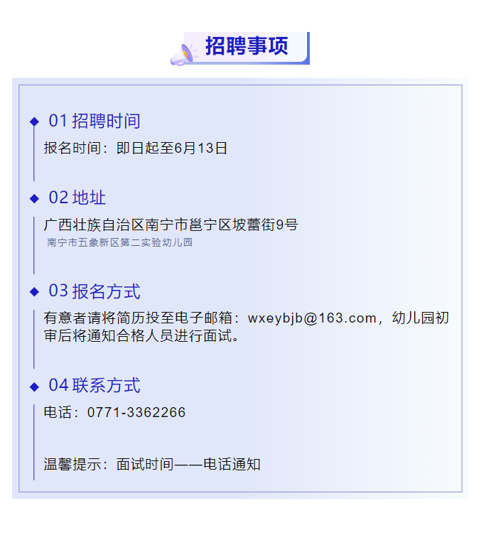 原文標(biāo)題:南寧市五象新區(qū)第二實(shí)驗(yàn)幼兒園招聘公告