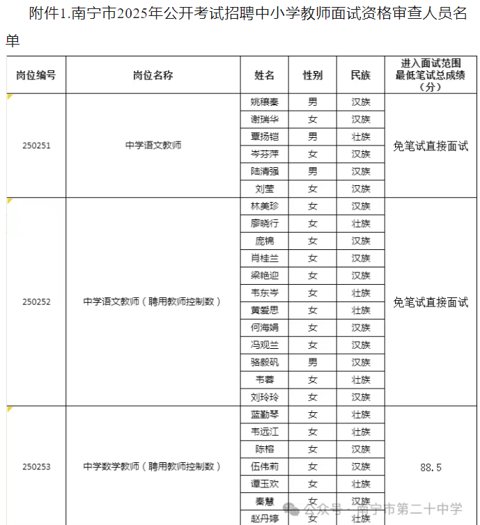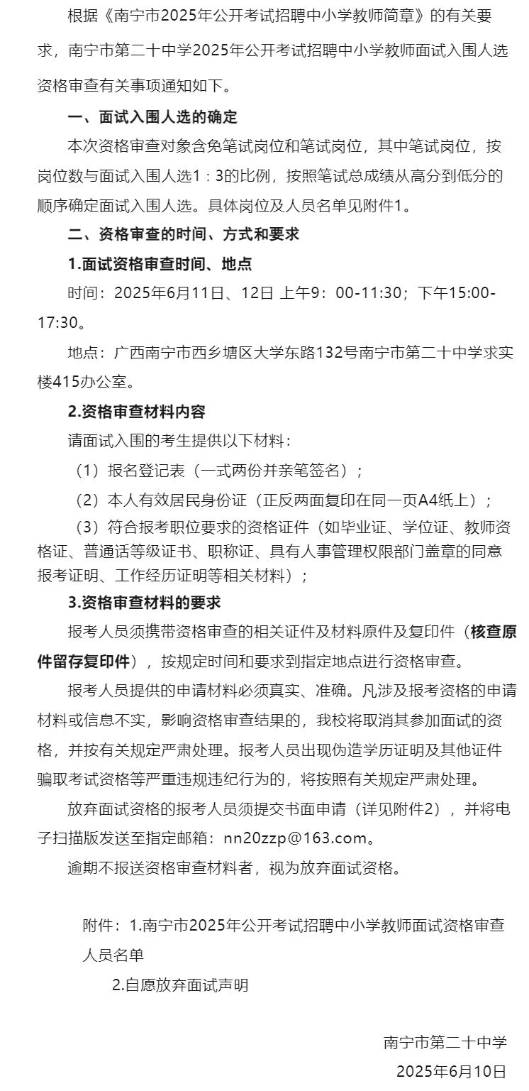 南寧市第二十中學(xué)2025年公開考試招聘中小學(xué)教師面試入圍人選資格審查通知