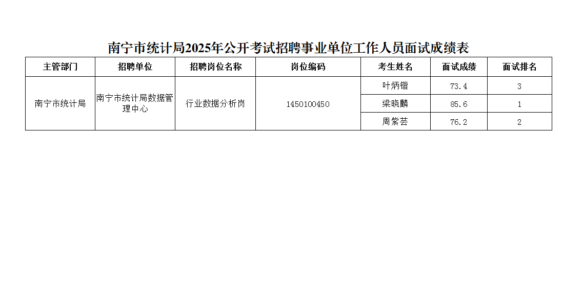原文標(biāo)題:南寧市統(tǒng)計局2025年公開考試招聘事業(yè)單位工作人員面試成績表