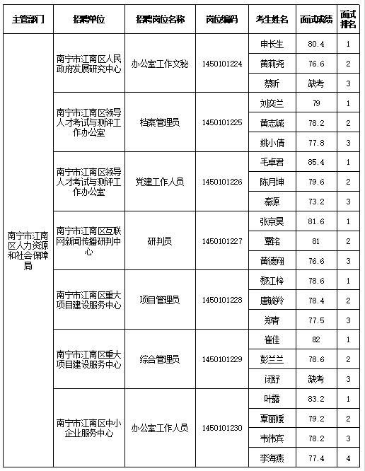 南寧市江南區(qū)人力資源和社會保障局2025年公開考試招聘事業(yè)單位工作人員面試成績表