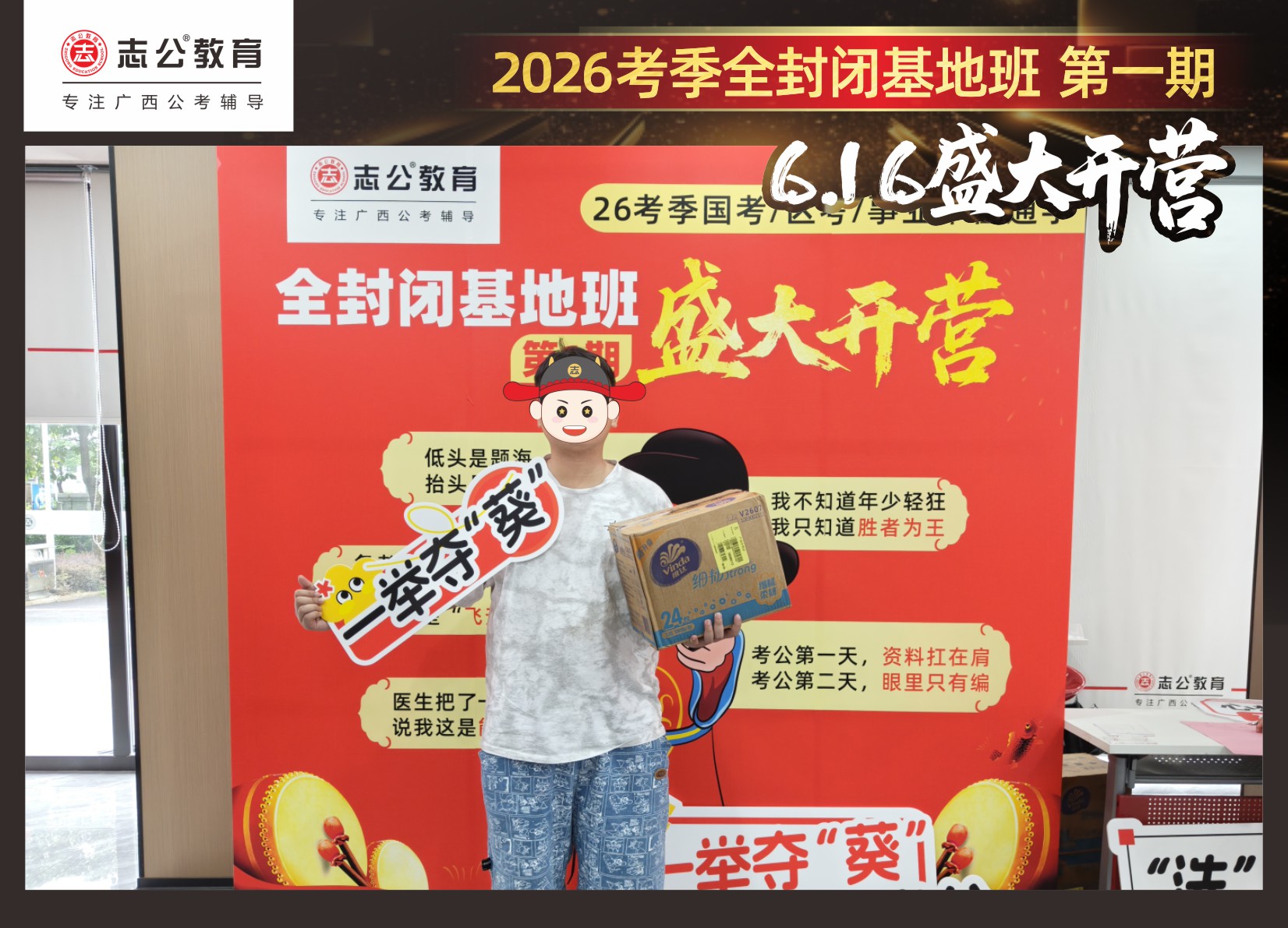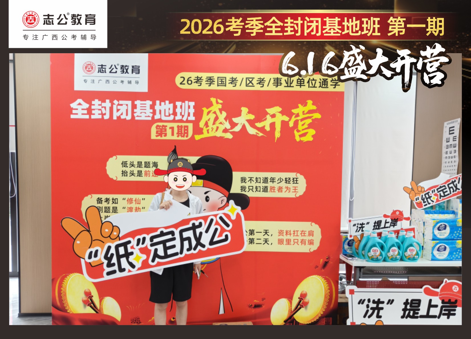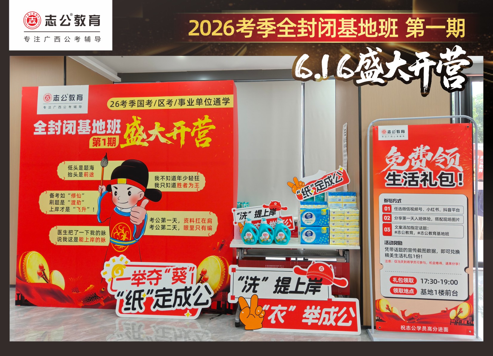 今天的開班還有一系列小活動(dòng)噢~瞧!——“學(xué)員打卡活動(dòng)”,所有今天到場的基地班學(xué)員,通過做一些小任務(wù)的方式,可以到前臺(tái)領(lǐng)取生活禮包即可領(lǐng)取生活禮品1份(一提六包的紙巾,或者一瓶洗衣液),這也是志公教育對(duì)所有學(xué)員的美好祝愿,預(yù)祝大家未來能夠“紙”定成公,“洗”提上/岸,“衣舉成公”!