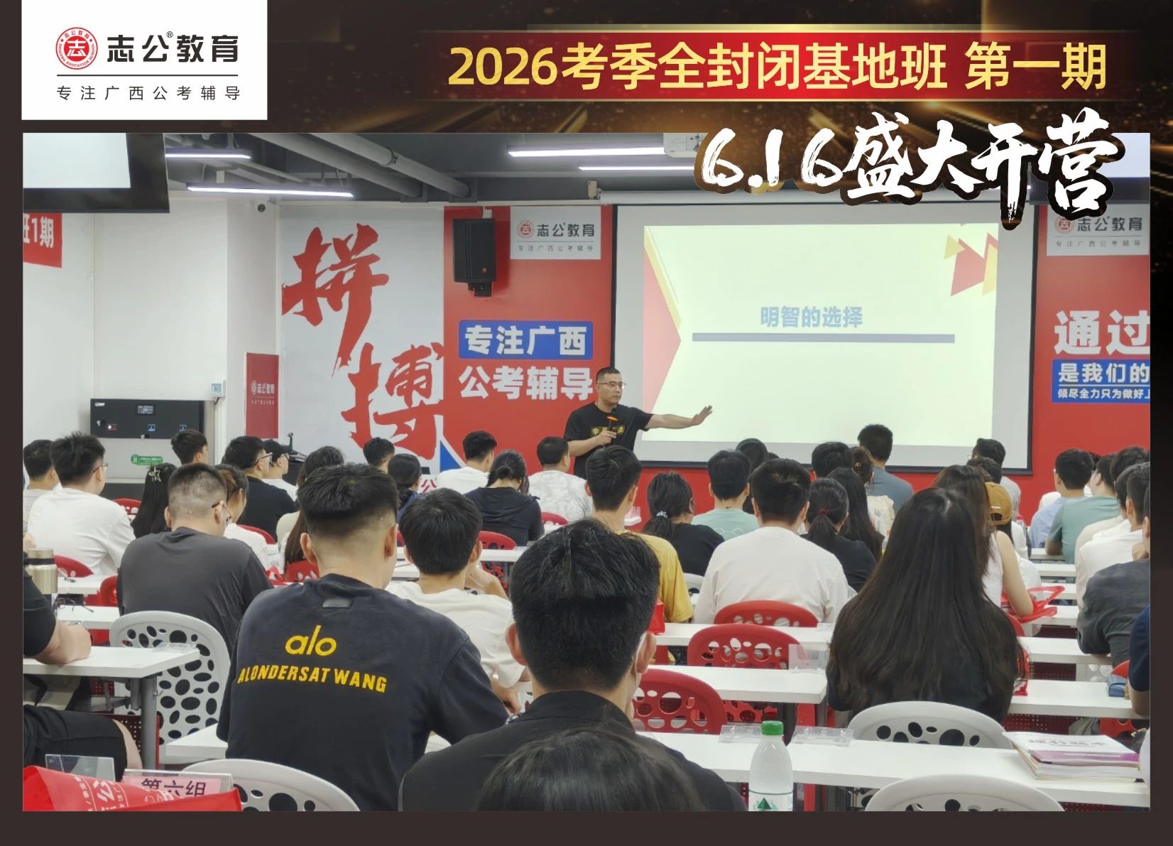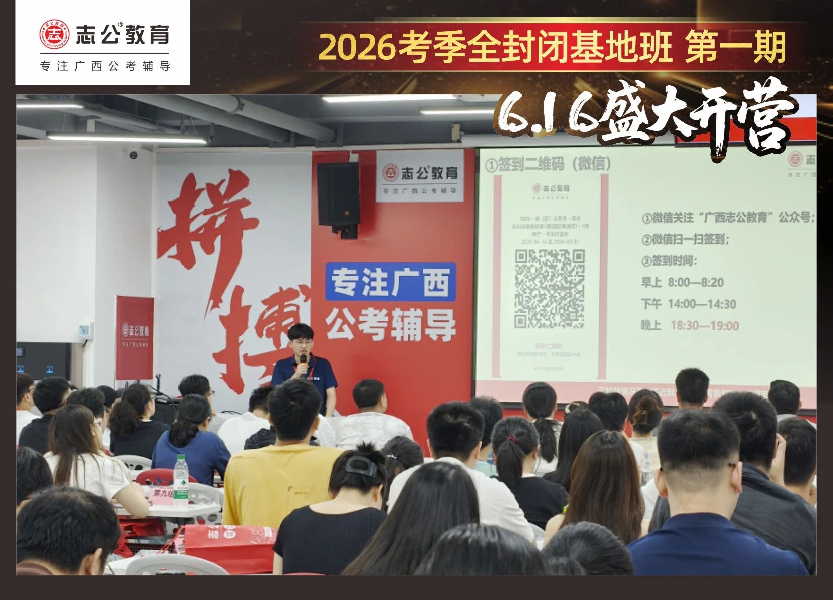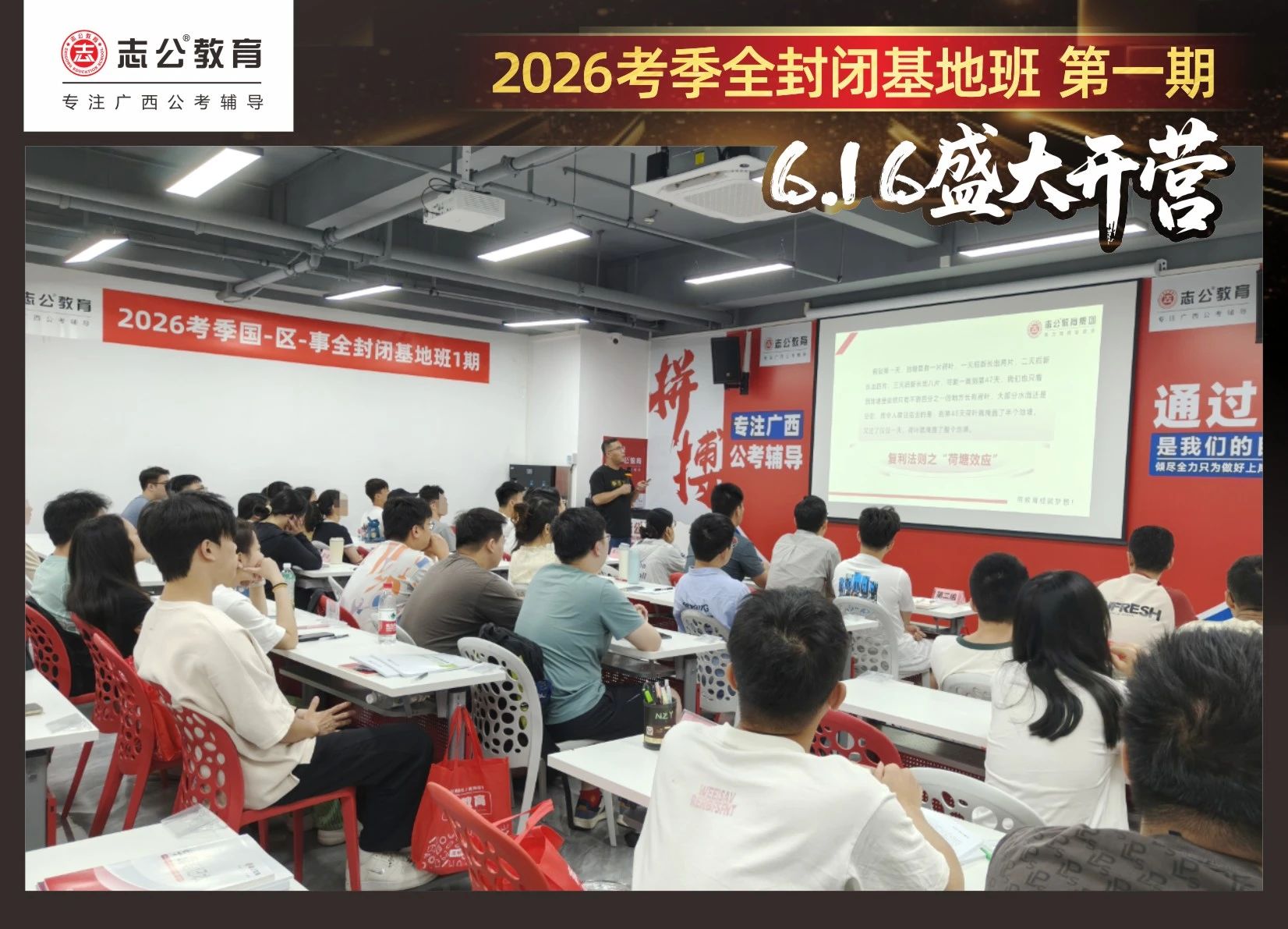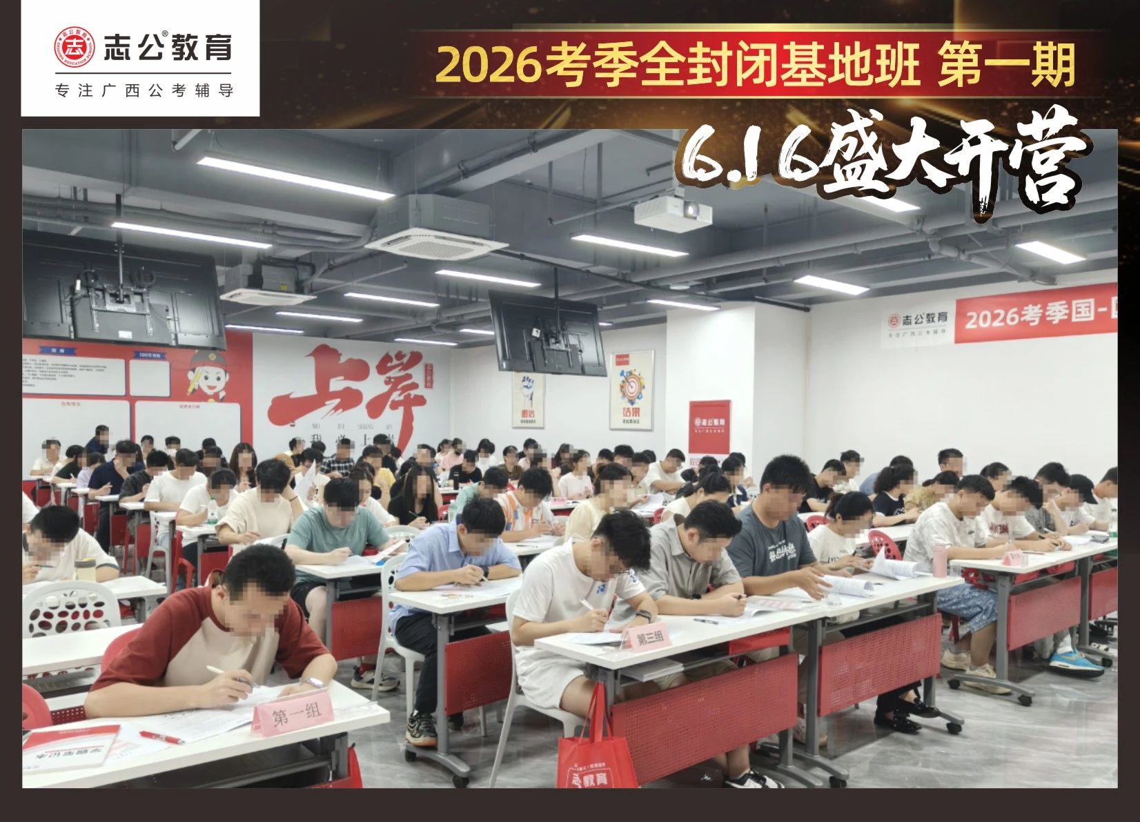大家稍作休息之后,就是咱們期待已久的開班典禮啦!學(xué)員們在班主任的引導(dǎo)下分組就坐。大家目光灼灼,熱情高漲,迫不及待想要開啟學(xué)習(xí)模式??催@座無虛席的盛況,志公26考季全封閉基地班第1期課程實(shí)力名不虛傳,各位學(xué)員用飽滿的熱情和積極的態(tài)度迎接此次課程的開展,期待大家能夠完成自己的蛻變和成長!