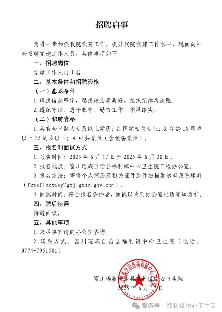 原文標題:福利鎮(zhèn)中心衛(wèi)生院招聘1名黨建工作人員