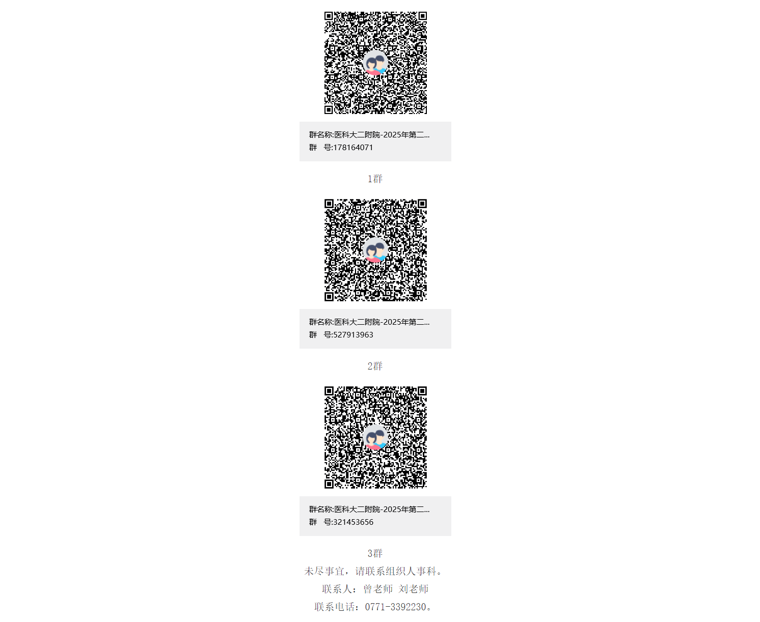 考核與面試的時(shí)間、地點(diǎn)另行通知,擇優(yōu)聘用。通過(guò)資格審核的考生名單及相關(guān)考試事宜將在“醫(yī)科大二附院-2025年第二批醫(yī)技藥行政招聘群”發(fā)布,請(qǐng)應(yīng)聘者務(wù)必進(jìn)群并關(guān)注群消息,不再另行通知。請(qǐng)通過(guò)搜索群號(hào)碼(1群:178164071、2群:527913963、3群:321453656)或掃碼加群(1群滿后請(qǐng)加2群、3群):