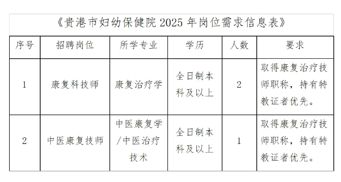 (三)臨床及業(yè)務(wù)人員(詳見《貴港市婦幼保健院2025年崗位需求信息表》)