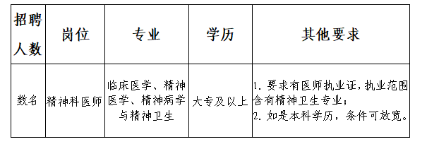 根據(jù)業(yè)務(wù)發(fā)展需要,持續(xù)加強(qiáng)我市心理健康和精神衛(wèi)生服務(wù)能力建設(shè),更好地滿(mǎn)足我市廣大人民群眾看病就醫(yī)需求,我院特面向社會(huì)公開(kāi)招聘數(shù)名編制外聘用工作人員,現(xiàn)將有關(guān)事項(xiàng)公告如下:
