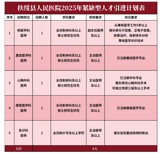 為進(jìn)一步充實現(xiàn)有人才隊伍,促進(jìn)醫(yī)院學(xué)科發(fā)展,提升醫(yī)院綜合實力,結(jié)合醫(yī)院實際工作需要,扶綏縣人民醫(yī)院決定面向社會進(jìn)行公開招聘各類醫(yī)學(xué)人才,具體招聘事宜如下: