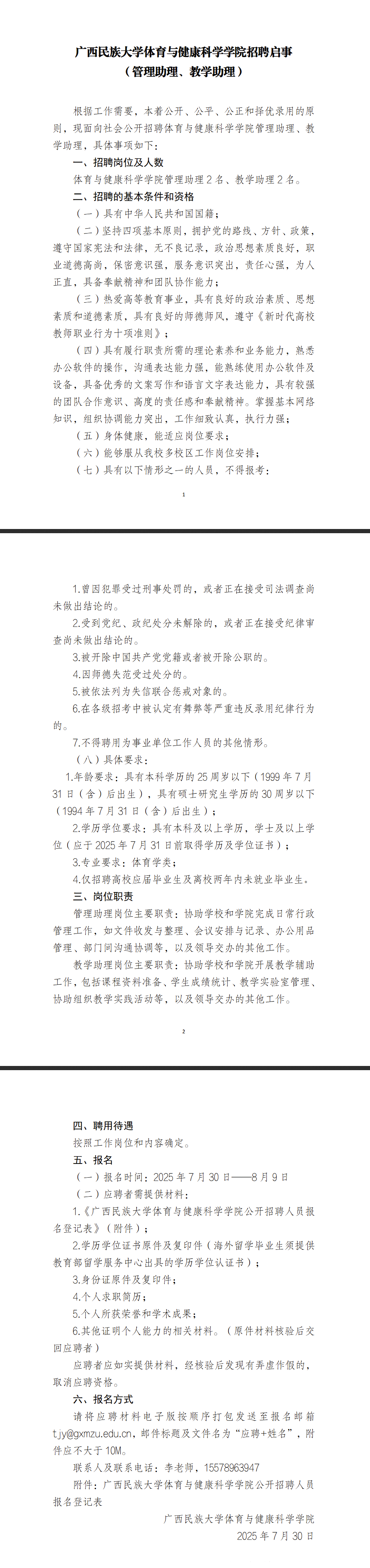 2025年廣西民族大學體育與健康科學學院招聘啟事 (管理助理、教學助理)