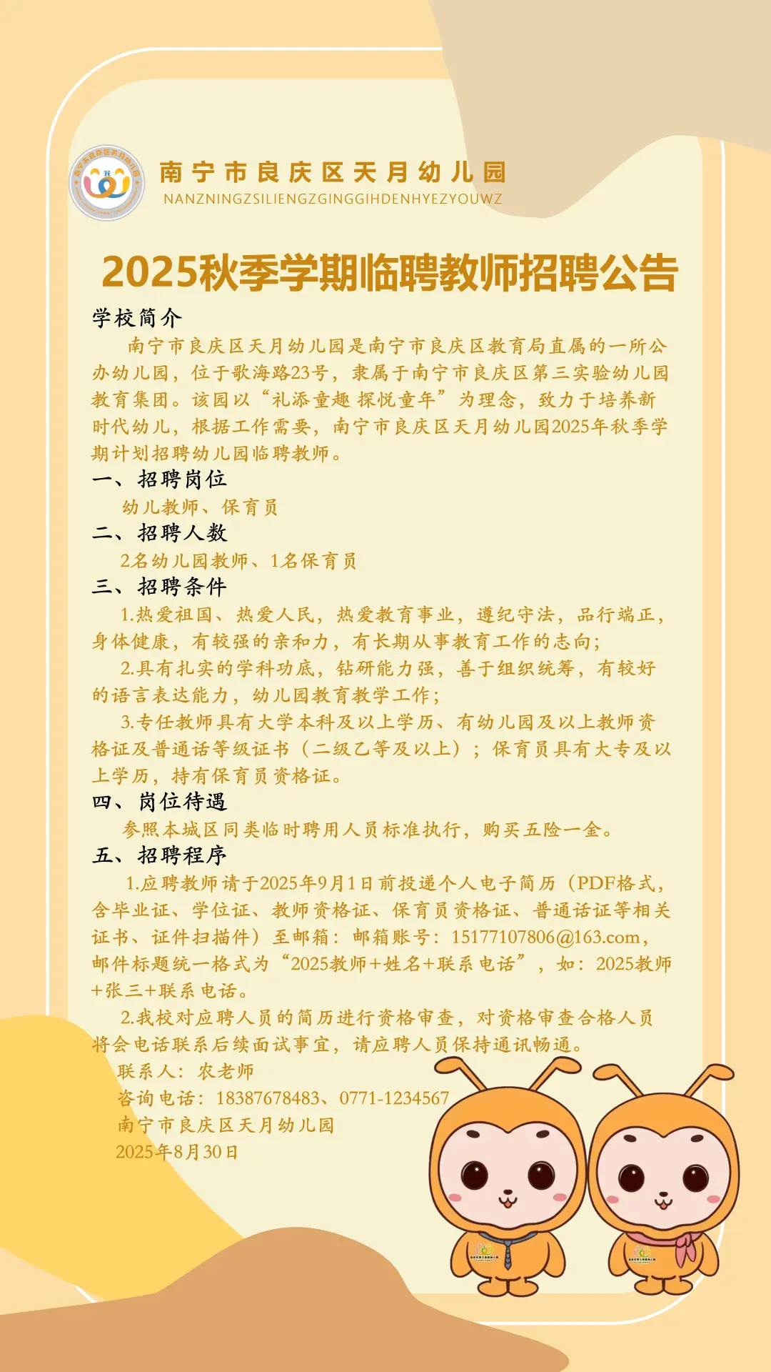原文標題:南寧市良慶區(qū)天月幼兒園2025年秋季學期臨聘教師招聘公告