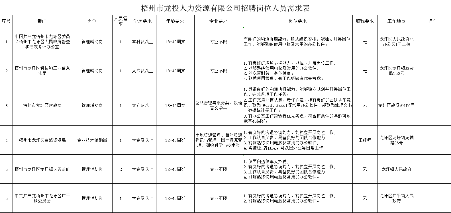 詳見附件1《梧州市龍投人力資源有限公司招聘崗位人員需求表》