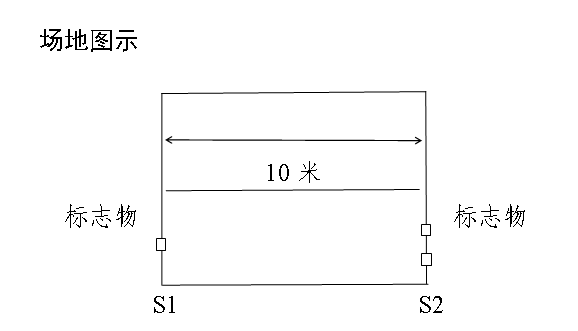 場(chǎng)地器材:場(chǎng)地為10米長的直線跑道,在跑道的兩端各劃一條5cm寬直線(S1和S2),將木塊(10cm×5cm×5cm)按每道3塊豎立擺放(其中2塊放在S2線上,1塊放在S1線上),秒表若干塊。