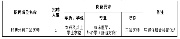 根據(jù)醫(yī)院發(fā)展需要,現(xiàn)面向社會急招肝膽外科主治醫(yī)師1人,有關(guān)招聘事項(xiàng)公告如下: