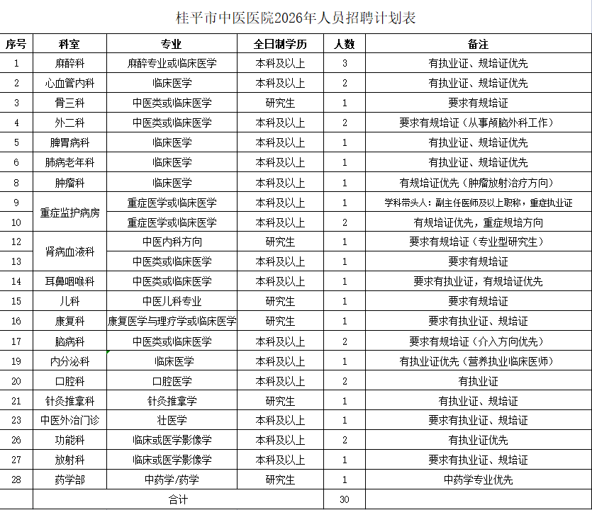 桂平市中醫(yī)醫(yī)院2026年招聘計(jì)劃表