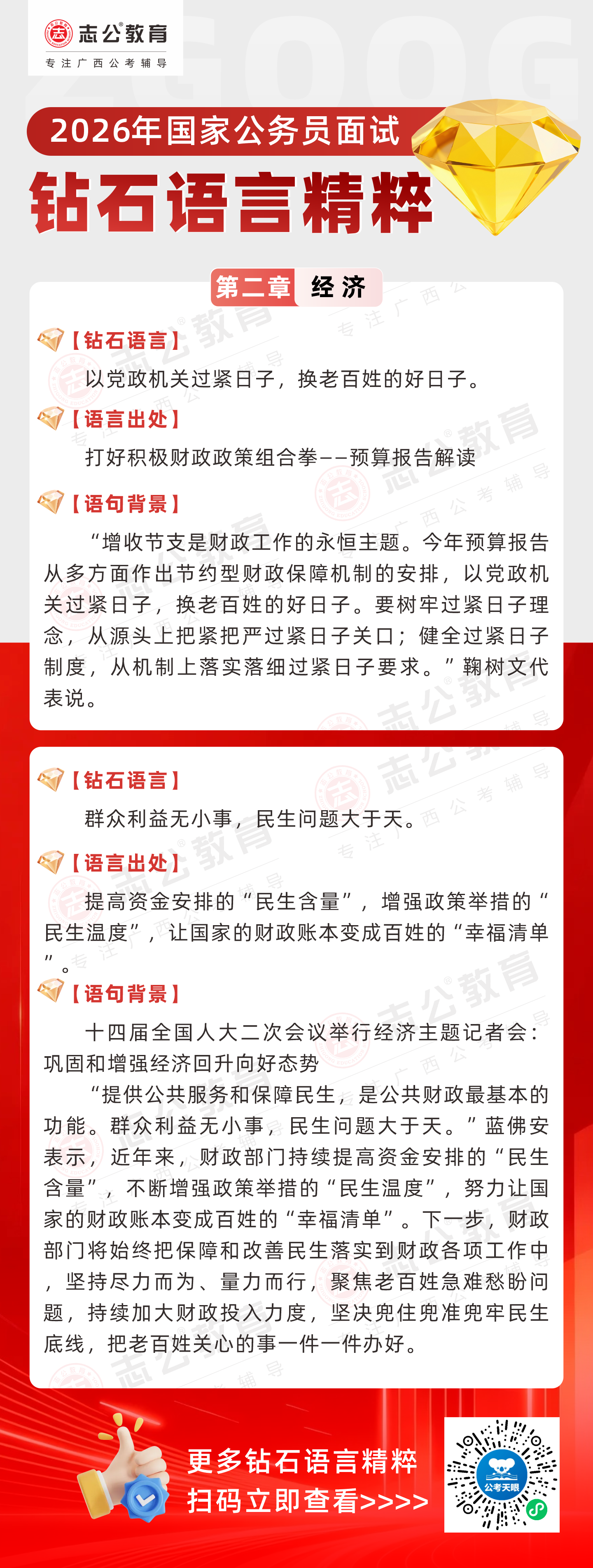 志公教育推出《2026國家公務(wù)員面試·鉆石語言精粹》經(jīng)濟(jì)篇!幫助考生把握經(jīng)濟(jì)類題目應(yīng)答邏輯,提升語言表達(dá)層次,助你在面試中脫穎而出。備考2026國考面試,從掌握“鉆石語言”開始!