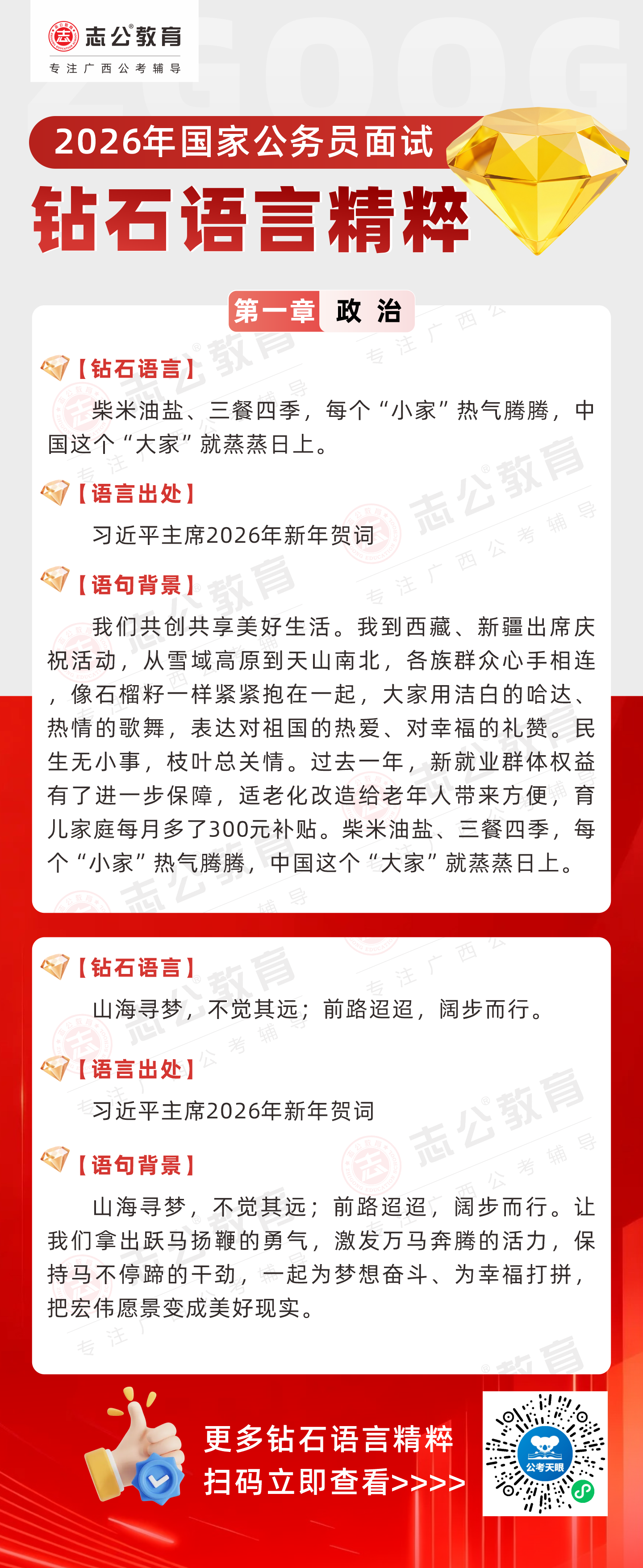 志公教育推出《2026國家公務員面試·鉆石語言精粹》政治篇!幫助考生把握政治類題目應答邏輯,提升語言表達層次,助你在面試中脫穎而出。備考2026國考面試,從掌握“鉆石語言”開始!