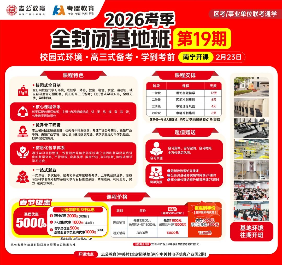?校園式環(huán)境,隔絕外界干擾:志公教育(中關(guān)村)2026考季全封閉基地班19期打造全日制校園式學(xué)習(xí)環(huán)境,高三嚴(yán)管式備考,一直可以學(xué)到考前。如果你自律性較差,需要一個好的學(xué)習(xí)氛圍和環(huán)境;如果你想要更快速上/岸,那你需要一個科學(xué)的學(xué)習(xí)體系,如果你想要考更好的職位,那你需要個性化和有效的提分方案,那么恭喜你,已經(jīng)找到了解決方法,請來志公教育全封閉基地班!