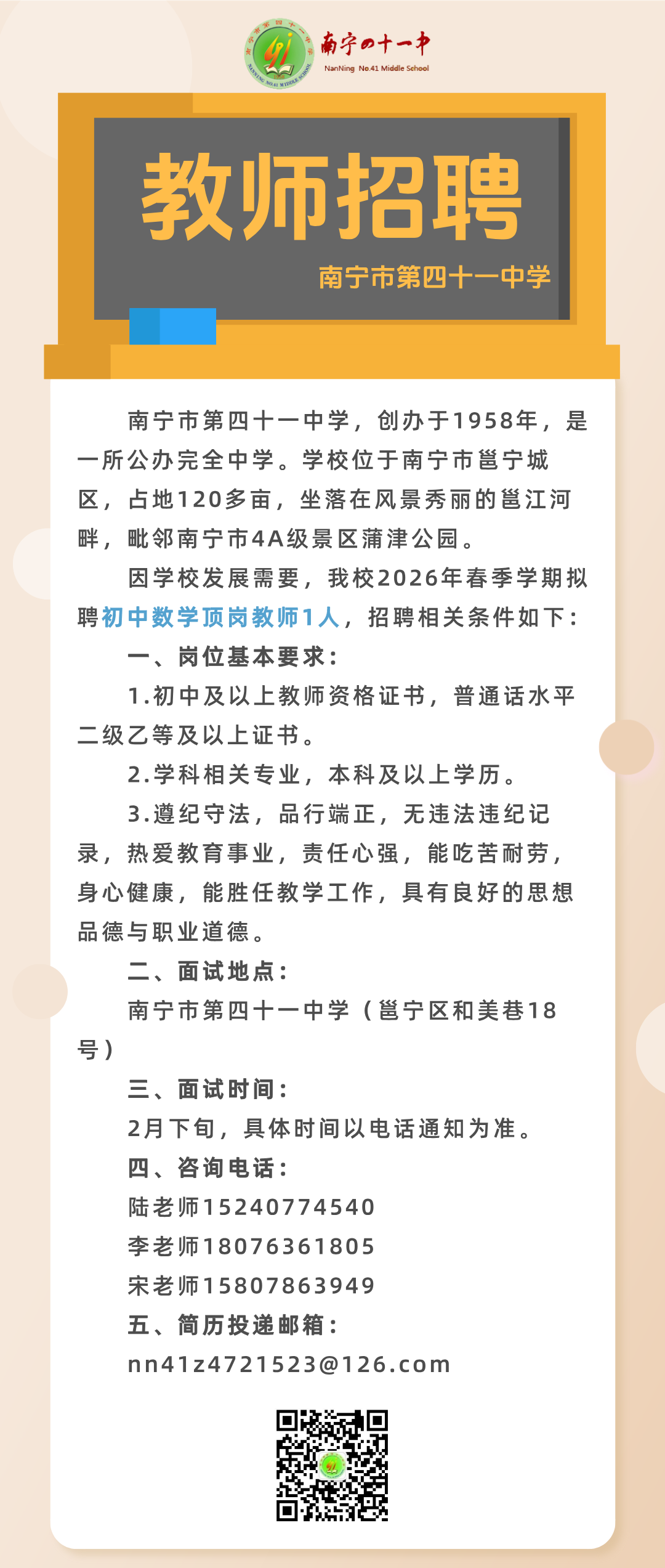 2026年春季學期南寧市第四十一中學關于公開招聘頂崗教師的啟事