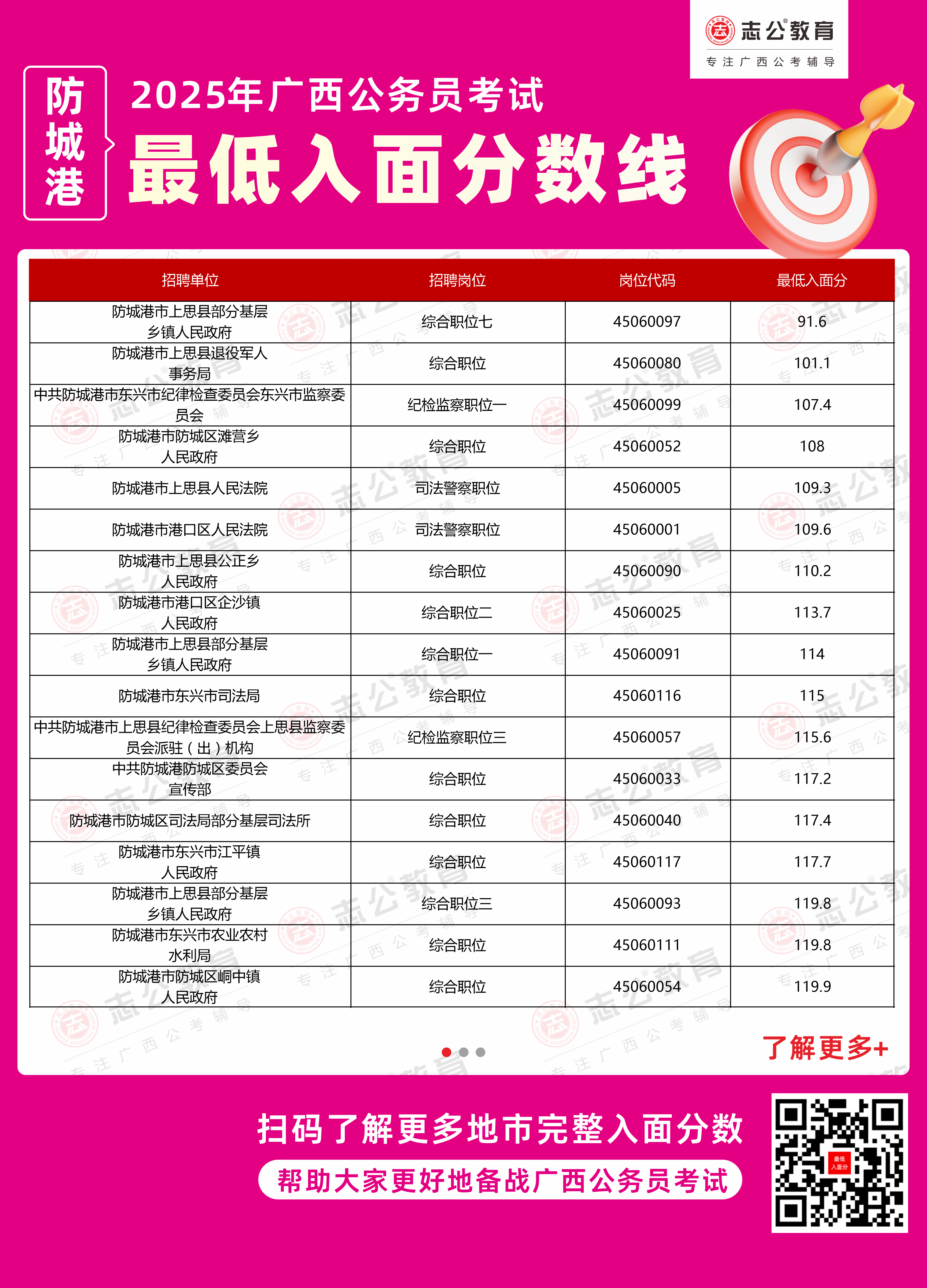 以下為志公教育根據(jù)官方發(fā)布的面試資格審查公告及公開(kāi)數(shù)據(jù)整理的防城港市部分單位的進(jìn)面最低筆試分?jǐn)?shù)(含照顧加分),數(shù)據(jù)僅供參考,具體以官方實(shí)際公布為準(zhǔn)。