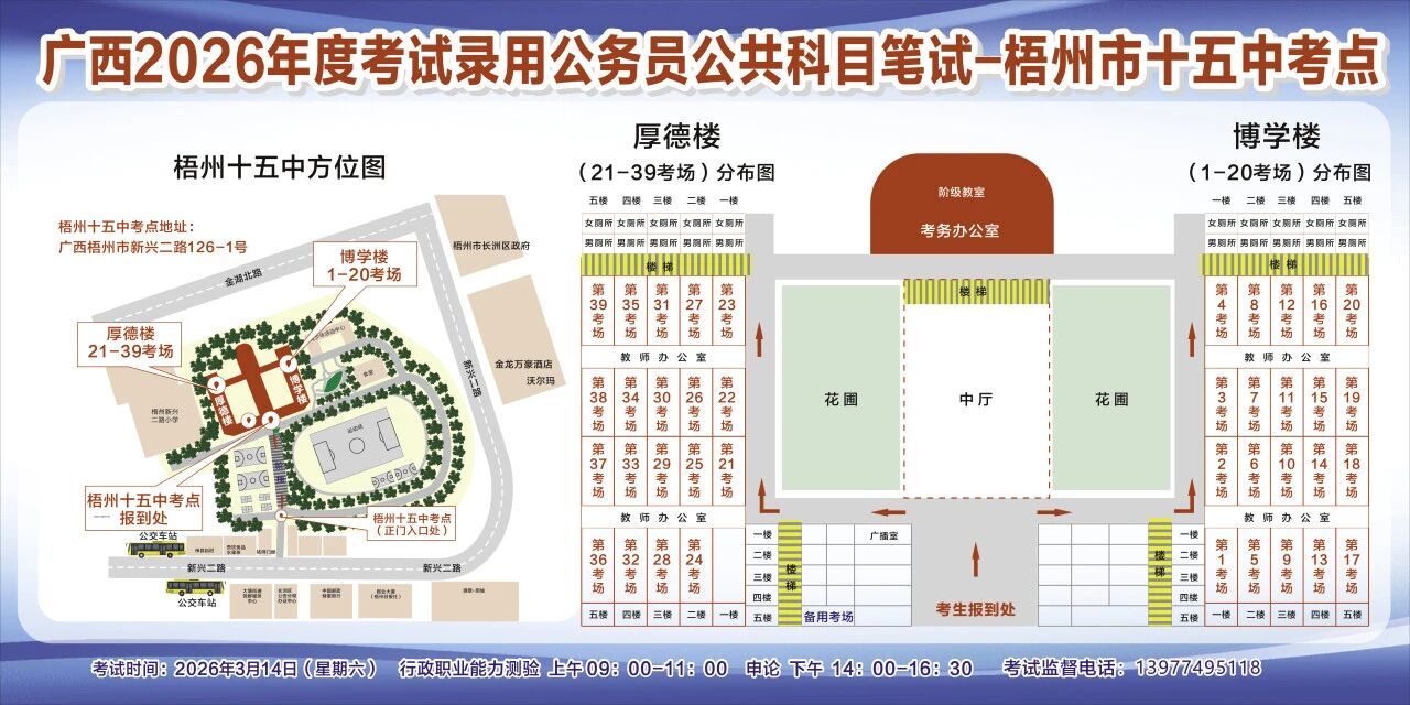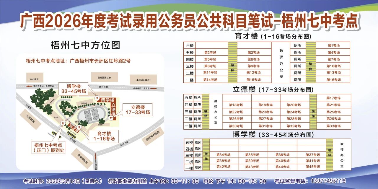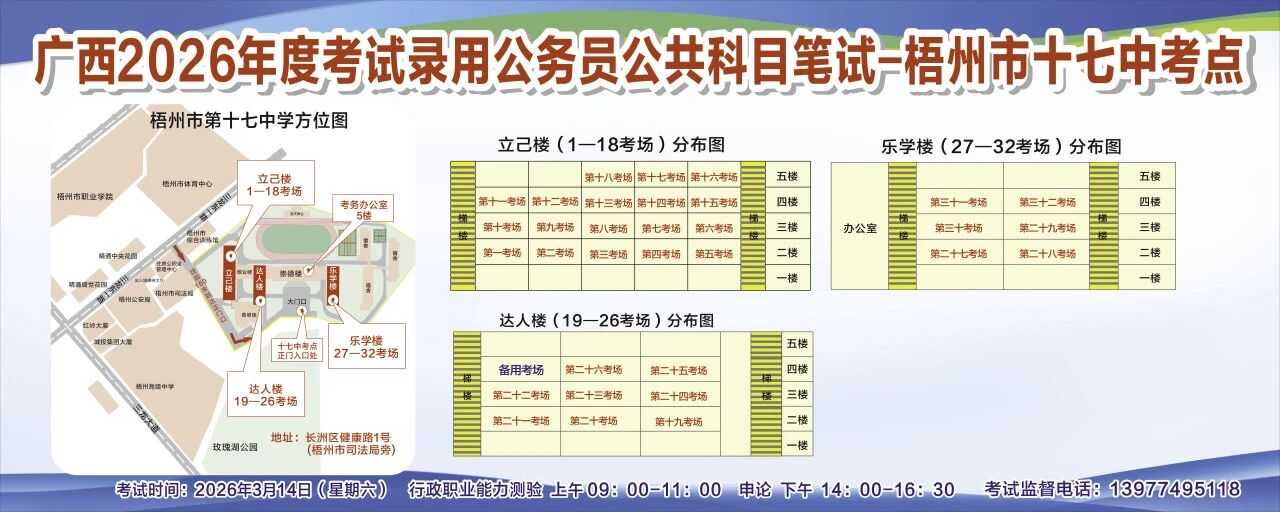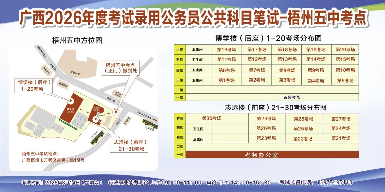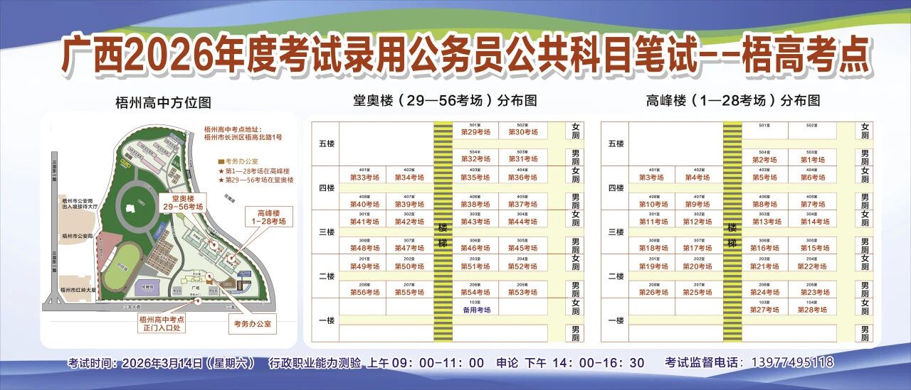 一、廣西2026年度考試錄用公務員(選調(diào)生)公共科目筆試將于3月14日舉行,梧州考區(qū)共設置10個考點,請考生提前熟悉各自考點位置、周邊環(huán)境及交通情況,考試當天提前出門做好準備,準時參加考試。