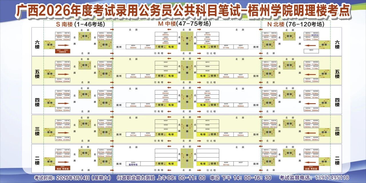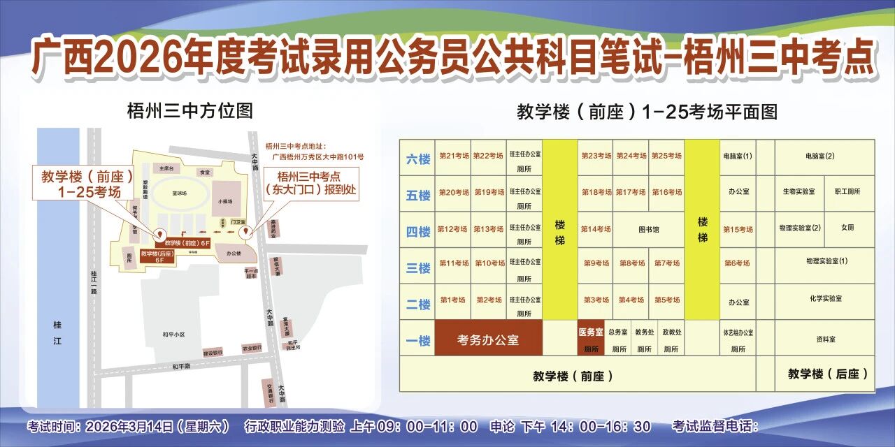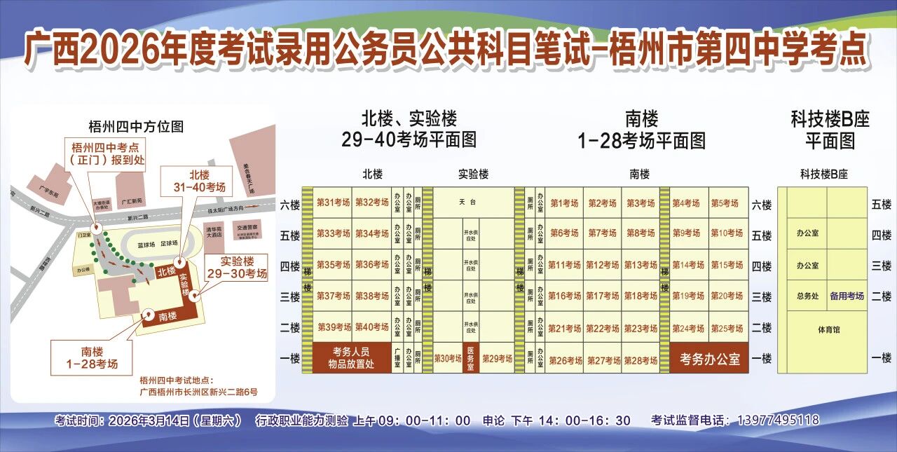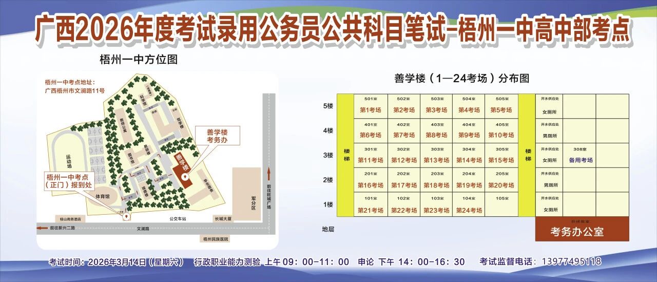 一、廣西2026年度考試錄用公務員(選調(diào)生)公共科目筆試將于3月14日舉行,梧州考區(qū)共設置10個考點,請考生提前熟悉各自考點位置、周邊環(huán)境及交通情況,考試當天提前出門做好準備,準時參加考試。