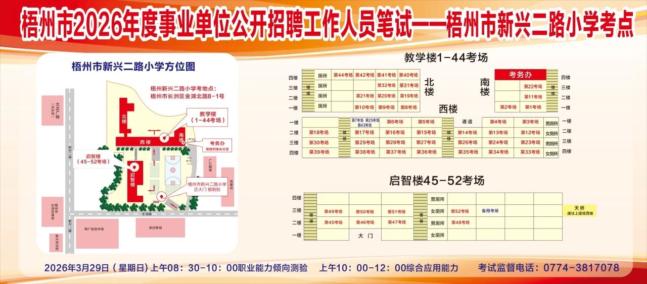 請(qǐng)考生提前熟悉各自考點(diǎn)位置、周邊環(huán)境及交通情況,考試當(dāng)天提前出門做好準(zhǔn)備,準(zhǔn)時(shí)參加考試。特別提示:因考點(diǎn)停車場(chǎng)地有限,所有考生車輛不得進(jìn)入考點(diǎn),請(qǐng)考生規(guī)劃好前往考點(diǎn)的交通方式和路線。此外,萬(wàn)秀區(qū)西堤二路新華路口至豐業(yè)藍(lán)天港灣段、長(zhǎng)洲區(qū)西堤三路梧州市人力資源和社會(huì)保障局至奧奇麗路口段道路實(shí)施臨時(shí)交通管制措施,如果考生通往考點(diǎn)途經(jīng)此路段,請(qǐng)?zhí)崆耙?guī)劃路線和出行時(shí)間。