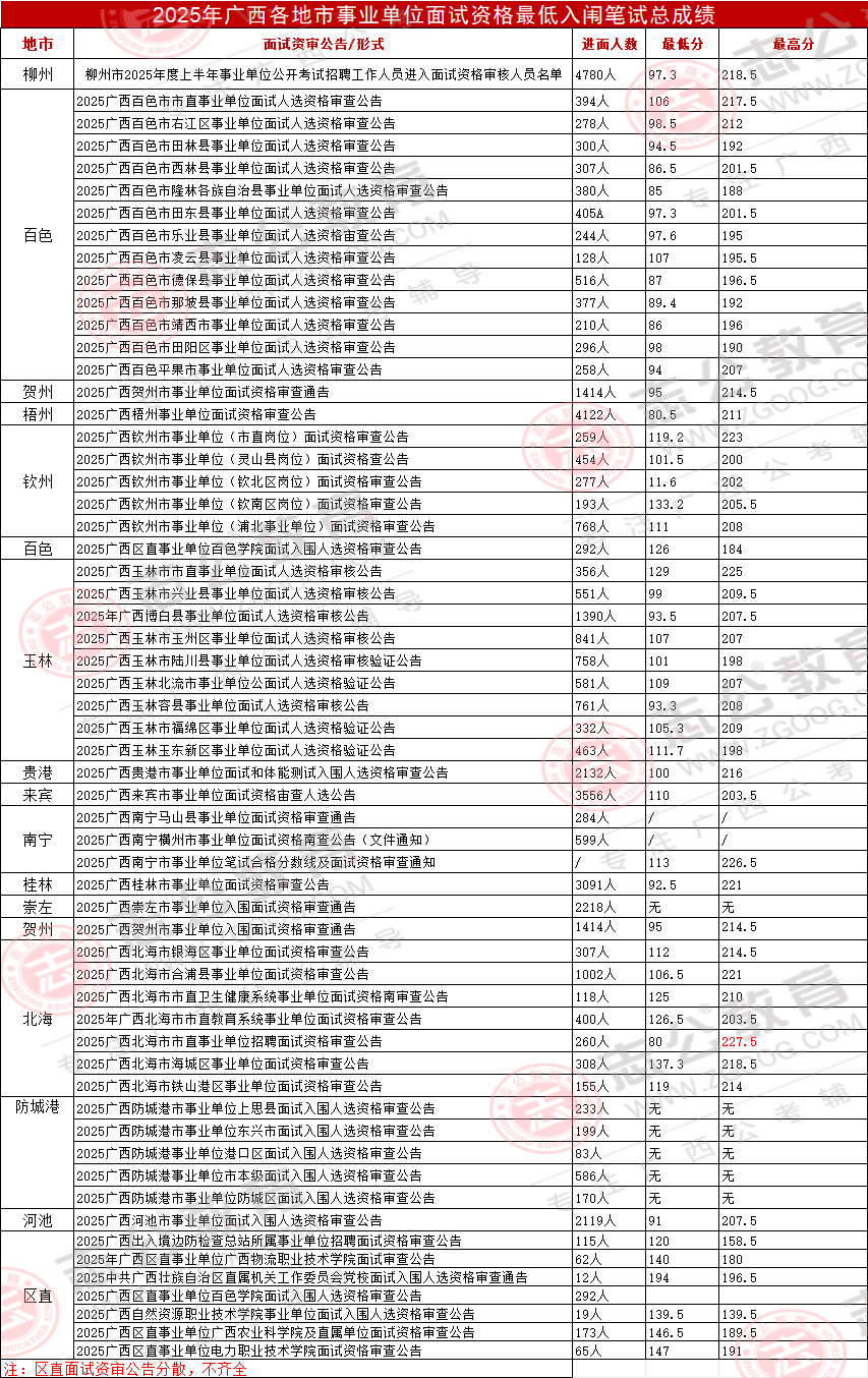 為了讓大家更直面廣西25年上半年事編聯(lián)考的進面分情況,廣西志公教育還根據(jù)官方給出的進入面試范圍人選zui低筆試總成績,給大家整理了除了部分區(qū)直單位之外的區(qū)直單位、14地市事業(yè)單位zui低、zui高入面分。