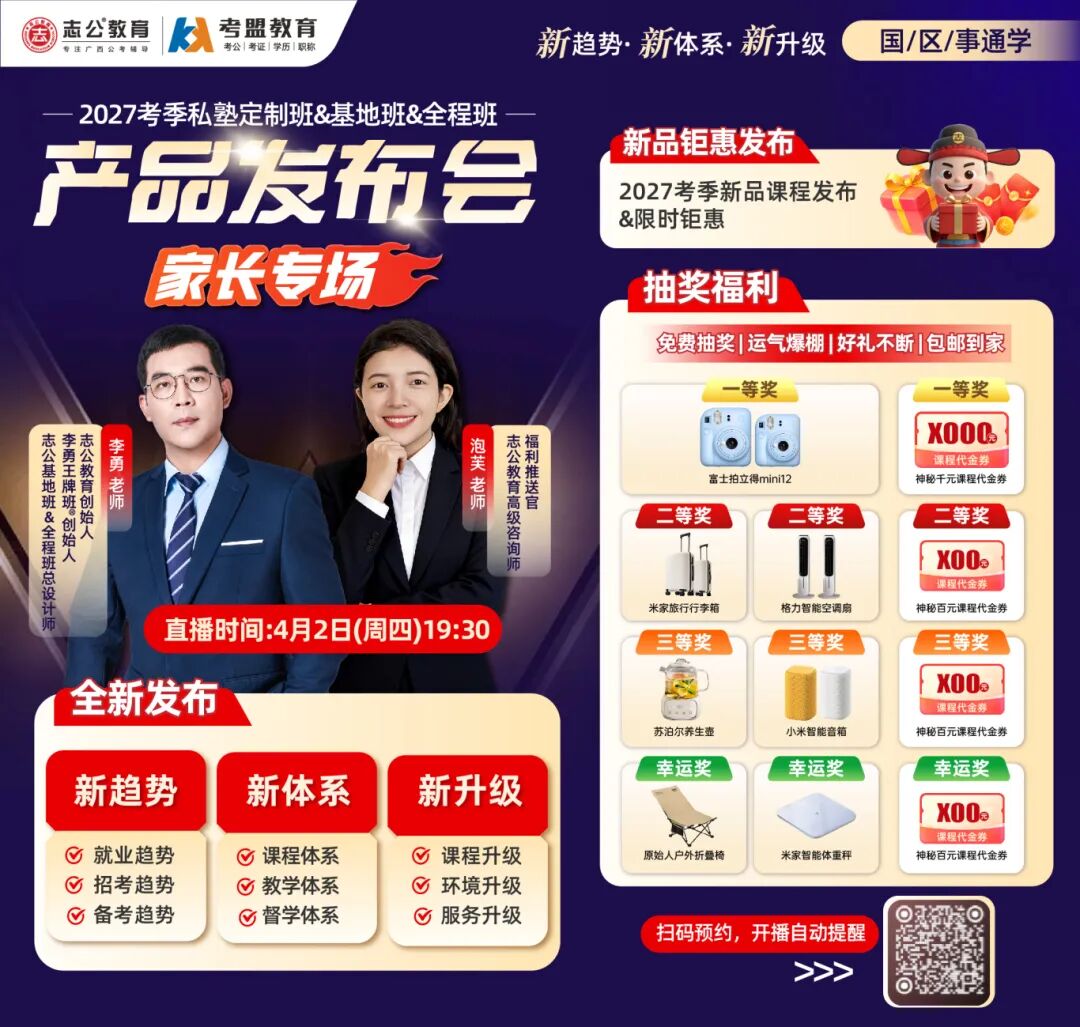 面對(duì)孩子棘手的就業(yè)與考公難題,家長們往往深感無力。針對(duì)這一系列關(guān)切的痛點(diǎn),志公教育于4月2日(周四)19:30舉辦“新趨勢(shì)·新體系·新升級(jí)——2027考季公考產(chǎn)品發(fā)布會(huì)”重磅直播,從專業(yè)的角度分析解讀當(dāng)前就業(yè)、招考、備考的新趨勢(shì),為廣大學(xué)子及家長送上備考的“及時(shí)雨”,滿足家長和學(xué)子們對(duì)獲得更優(yōu)質(zhì)的學(xué)習(xí)環(huán)境、課程體系、督學(xué)服務(wù)、教學(xué)成果的期待。同時(shí)直播間免費(fèi)送出更多超值福利。
