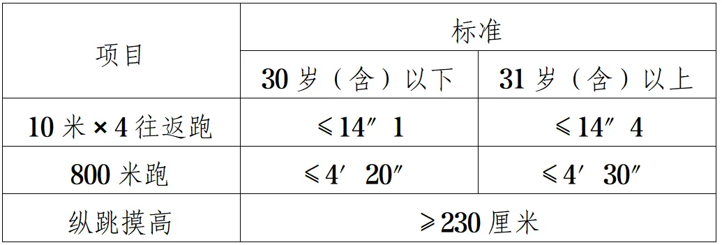 按照《關(guān)于印發(fā)〈公安機關(guān)錄用人民警察體能測評項目和標準〉的通知》(公政治〔2024〕60號)執(zhí)行。體能測評項目包括10米×4往返跑、1000米(男)/800米(女)跑、縱跳摸高等3個項目。其中,綜合管理類、執(zhí)法勤務(wù)類職位測查全部3個項目,警務(wù)技術(shù)類職位免予測查1000米(男)/800米(女)跑項目;對于專業(yè)人才緊缺難以形成競爭的特殊職位(緊缺職位),報考人員需在參加體能測評前,從3項體能測評項目中選擇2項參加測試。凡應(yīng)測項目中任意一項不達標的,即為體能測評不合格。具體如下:
