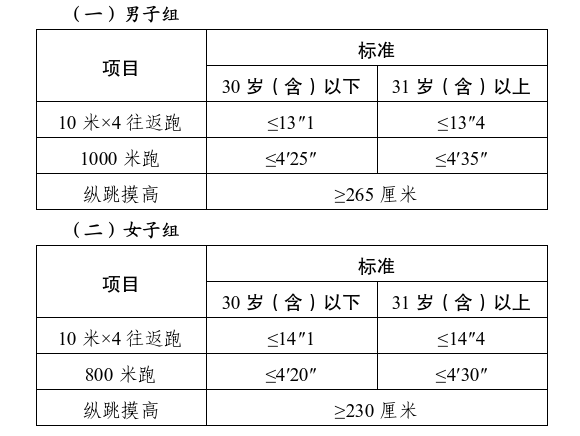 體能測評執(zhí)行中央組織部辦公廳、公安部辦公廳印發(fā)的《公安機關錄用人民警察體能測評項目和標準》(公政治〔2024〕60號)有關規(guī)定,縱跳摸高每人最多可測3次,10米×4往返跑每人最多可測2次,男子1000米(女子800米)每人最多可測1次。體能測評的項目和標準如下: