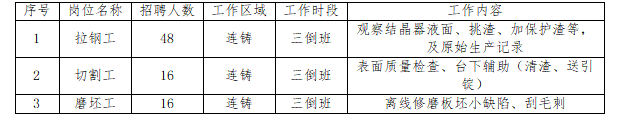 1、愿意從事鋼鐵生產(chǎn)作業(yè)工作,初中畢業(yè)及以上,年齡18-45歲,身體健康,無職業(yè)禁忌;